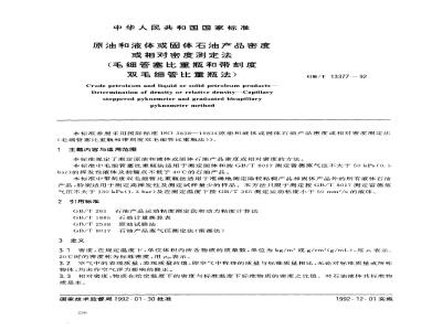 本标准规定了测定原油和液体或固体石油产品密度或相对密度的方法。本标准中毛细管塞比重瓶法适用于测定固体和按GB8017测定雷德蒸气压不大于50kPa(0.5bar)的挥发性液体及初馏点不低于40℃的石油产品。本标准中带刻度双毛细管比重瓶法适用于准确地测定除较粘稠产品和固体产品外的所有液体石油产品,特别适用于测定高挥发性及测定试样量少的样品。本方法只限于测定按GB8017测定雷德蒸气压不大于130kPa(1.3bar)及在测定温度下按GB265测定运动粘度小于50mm2/s的液体。 GB/T 13377-1992 原油和液体或固体石油产品密度或相对密度测定法(毛细管塞比重瓶和带刻度双毛细管比重瓶法) GB/T13377-1992 标准下载解压密码:www.bzxz.net
