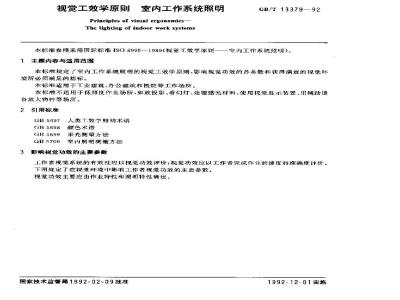 本标准规定厂家内工作系统照明的视觉工效学原测,影响视觉功效的各参数和获得满意的视觉环境所必须满足的指标。