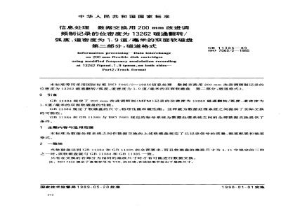 GB11384规定了200mm改进调频制(MFM)记录的位密度为13262磁通翻转/弧度、道密度为1.9道/毫米的双面软磁盘的性能。GB11384规定了软磁盘的尺寸、物理性能和磁性能。这样就为数据处理系统之间提供了实际交换的可能性。