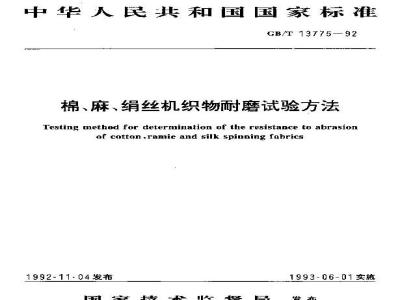 棉、麻、绢丝机织物耐磨试验方法Testing method for cetermuination of the resistaace to abrasionof cotton.ramie and silk spinning fahrics1992-11-04发布