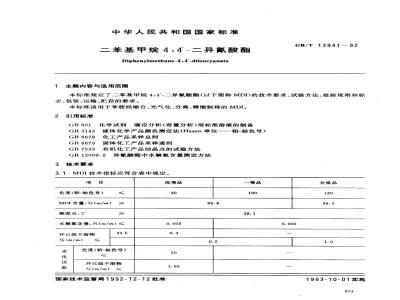 本标准规定了二苯基甲烷4,4'-二异氰酸酯(以下简称MDI)的技术要求、试验方法、检验规则和标志、包装、运输、贮存的要求。本标准适用于苯胺经缩合、光气化、分离、精馏制得的MDI。2引用标准