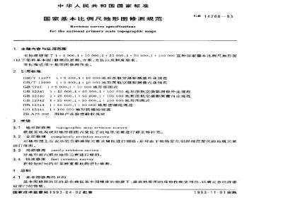 本标准规定了1∶5000、1∶10000、1∶25000、1∶50000、1∶100000五种国家基本比例尺地形图修测的原则、方案、方法以及精度要求。本标准适用于基本图修测作业。 GB/T 14268-1993 国家基本比例尺地形图修测规范 GB/T14268-1993 标准下载解压密码:www.bzxz.net