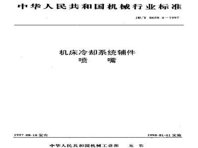 JB/T8650.4-1997 本标准规定了机床冷却系统辅件的型式及基本参数、产品标记及技术要求。 本标准适用于机床的冷却系统,其他机械的冷却系统亦可参照使用。 JB/T 8650.4-1997 机床冷却系统辅件 喷嘴 JB/T8650.4-1997 标准下载解压密码:www.bzxz.net