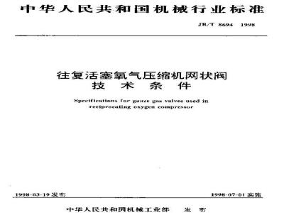 本标准规定了往复活塞氧气压缩机网状阀的技术要求、试验方法、检验规则及标志、包装与贮存等。本标准适用于往复活塞氧气压缩机网状阀(以下简称气阀)。本标准也适用于其他气体压缩机网状阀。 JB/T 8694-1998 往复活塞氧气压缩机网状阀 技术条件 JB/T8694-1998 标准下载解压密码:www.bzxz.net