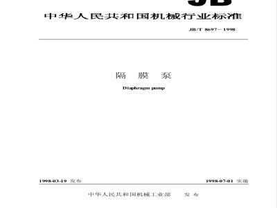 JB/T 8697-1998 本标准规定了隔膜泵的基本参数,技术要求,试验方法,检验规则,标志、包装及贮存。 本标准适用于输送温度为 5℃~120℃、粘度 0.3~850mm2/s、粒度 ≤8mm、浓度 ≤75% 介质的机动液压式隔膜泵。其额定流量范围为 630m3/h;额定排出压力范围为 25MPa 。 JB/T 8697-1998 隔膜泵 JB/T8697-1998 标准下载解压密码:www.bzxz.net
