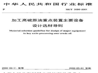 木导则是根据中国石化(2001)建探字188导文的通知,由中田石化集团洛阳石油化工工程公司对原加T高硫原泊至点装置主要设各设计选材导则3SH/T3096-1999进行修订而成,本导测共分4些和?个附录,这次储汀的主要内容有:1扩大了本则的适用范至,补充了加工高硫高酸原油(5含l.%(wt):酸值大于0.5mgkOH/g的重点装置主要设务设计选材规定:2增加了“加整裂化装受土要没的挂荐用材表\3删除了原附录A:井将其相应的内容编入“加工高靠高酸原油蒸谣装置主要设备的推荐用材表”中;