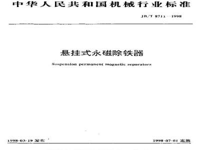 JB/T 8711-1998 本标准规定了悬挂式永磁除铁器的产品分类,技术要求,试验方法,检验规则,标志、包装、运输和贮存。 本标准适用于悬挂式永磁除铁器。该除铁器配合带式输送机使用,可除去混杂在散状非磁性物料中重量为 0.1~25kg 的铁磁性物品. JB/T 8711-1998 悬挂式永磁除铁器 JB/T8711-1998 标准下载解压密码:www.bzxz.net