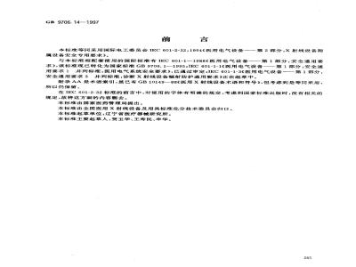 与本标准相配套使用的国际标准有IEC601-11988《医用电气设备—一第1部分:安全通用要求》,该标准现已转化为国家标准GB9706.1一1995;IEC601-1-1《医用电气设备一—第1部分:安全通用要求1并列标准:医用电气系统安全要求》,已通过审定,IEC601-1-3《医用电气设备一一第1部分:安全通用要求3并列标准:诊断X射线设备辐射防护通用要求》正在起草中。附录AA是术语索引,虽已有GB10149一88《医用X射线设备术语和符号》,但考虑到是等同采用,所以仍保留。