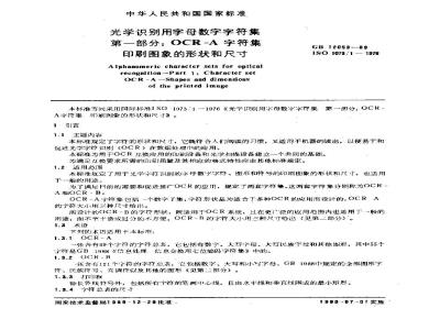 本标准规定了用于光学字符识别的字母数字符、图形和符号的印刷图象的形状和尺寸,也适用于一般的用途。