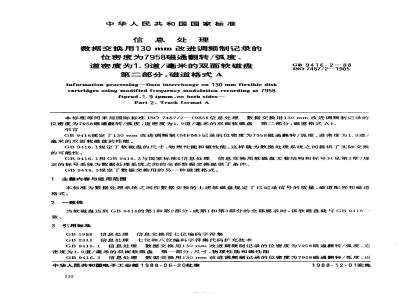 GB9416规定了130mm改进调频制(MFM)记录的位密度为7958磁通翻转/孤度,道密度为1.9道/毫米的双面软磁盘的性能。