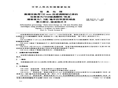 GB9416规定了130mm改进调频制(MFM)记录的位密度为7958磁通翻转/弧度、每面40道的双面软磁盘的性能。