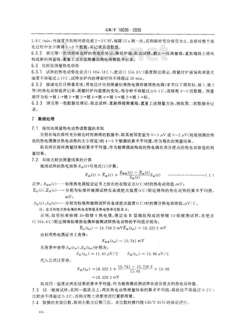 取其同一温度点两次结果的算术平均值,作为被测偶丝测试样在该分度点的热电动势值。7.3同-被测试样,在同一温度点上,两次热电动势测量结果的算术平均值,熔丝法不得超过0.2(,比较法不得超过0.3'C,否则应按上述要求进行重新测量。7.4数据的有效位数取到小数点后第三位。末未位数的修约按GB/T8170的规定进行:600
