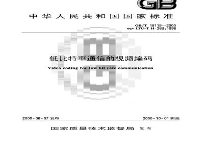 本标准是等效采用国际电信联盟ITU-TH.263:1996《低比特率通信的视频编码》建议制定的,其中考虑到我国通信网及具体应用业务情况,作适当改动,更适合于我国国情。标准中的章节依据GB/T1.1—1993的规定作适当改动。原文中有关“基于语法的算术编码模式”改为“语义基算术编码模式”更适于国内应用。GB/T18119—2000《低比特率通信的视频编码》包括8个附录。本标准的附录A、B、C、D、E、F、G、H为标准的附录。本标准由中华人民共和国信息产业部提出。本标准由信息产业部电信研究院归口。本标准起草单位:信息产业部电信传输研究所。本标准主要起草人:黄东霖、杨淑京、辛伟。I