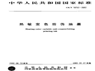 本标准只规定热敏变色防伪袖墨防伪特性的质量要求,因此在检测时需要与相关的油要(如:用于平版印部、凹版印测、丝阿印制等各种印方式的减显)特性质摄要求的标难间时使用,本标准虫中华人风共和国国家质量临偿格验检疫总局提出.本标准由全国防标难化技术委员会归口。本标准基革单位:公安部防伪产品质量监督检险中心、北京中标国安龄技术公司,本标准起草人:玉孝平、刘树斌、王数资、阅育华、高利生GB/T18752—2002