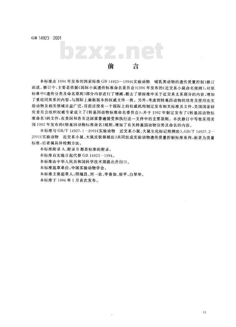 本标准由1994年发布的国家标准GB14923-1994《实验动物哺乳类动物的遗传质量控制》修订而成。修订中,主要是依据《国际小鼠遗传标准命名委员会》1996年发布的《近交系小鼠命名规则》,对原标准中《遗传分类及命名原则》部分内容进行了增减:删去了原标准中关于近交系支系部分的内容,增加了重组同类系的内容,与国际上最新版本的权威文件一致。另外,考虑到转基因动物的培育及使用在实验动物及相关领域日益广泛,目前还没有一个国际上的权威机构制定发布相关标准及文件,美国国家研究委员会组织权威专家成立了《转基因动物标准命名委员会》,并于1992年制定发布了《转基因动物标准命名》的文件,在美国和各发达国家普遍接受和执行这一文件中的主要原则。本次修订中等效采用美国1992年发布的《转基因动物标准命名》规则,增加了有关转基因动物分类及命名的内容。本标准与GB/T14927.1—2001《实验动物近交系小鼠、大鼠生化标记检测法》、GB/T14927.2-2001《实验动物近交系小鼠、大鼠皮肤移植法》共同组成实验动物遗传质量控制标准系列,前者为质量标准,后者属具体检测方法。