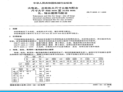 Tolerances and fits for large-size of largeelectrical machines and hydraulic turbinesTolerance stripsand fits for size of holesand shaftsabove500mmto3150mm本标准规定了大电机、水轮机大尺寸孔、轴公差带与配合。本标准适用于基本尺寸大于500mm至3150mm的公差带与配合。2