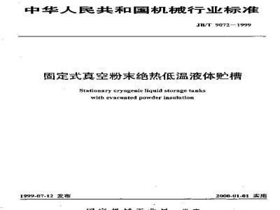 固定式真空粉末绝热低温液体购槽Statlonary tryogenie liquidstoragetakswith evacaated powder insulatignJB/T90T2—1999