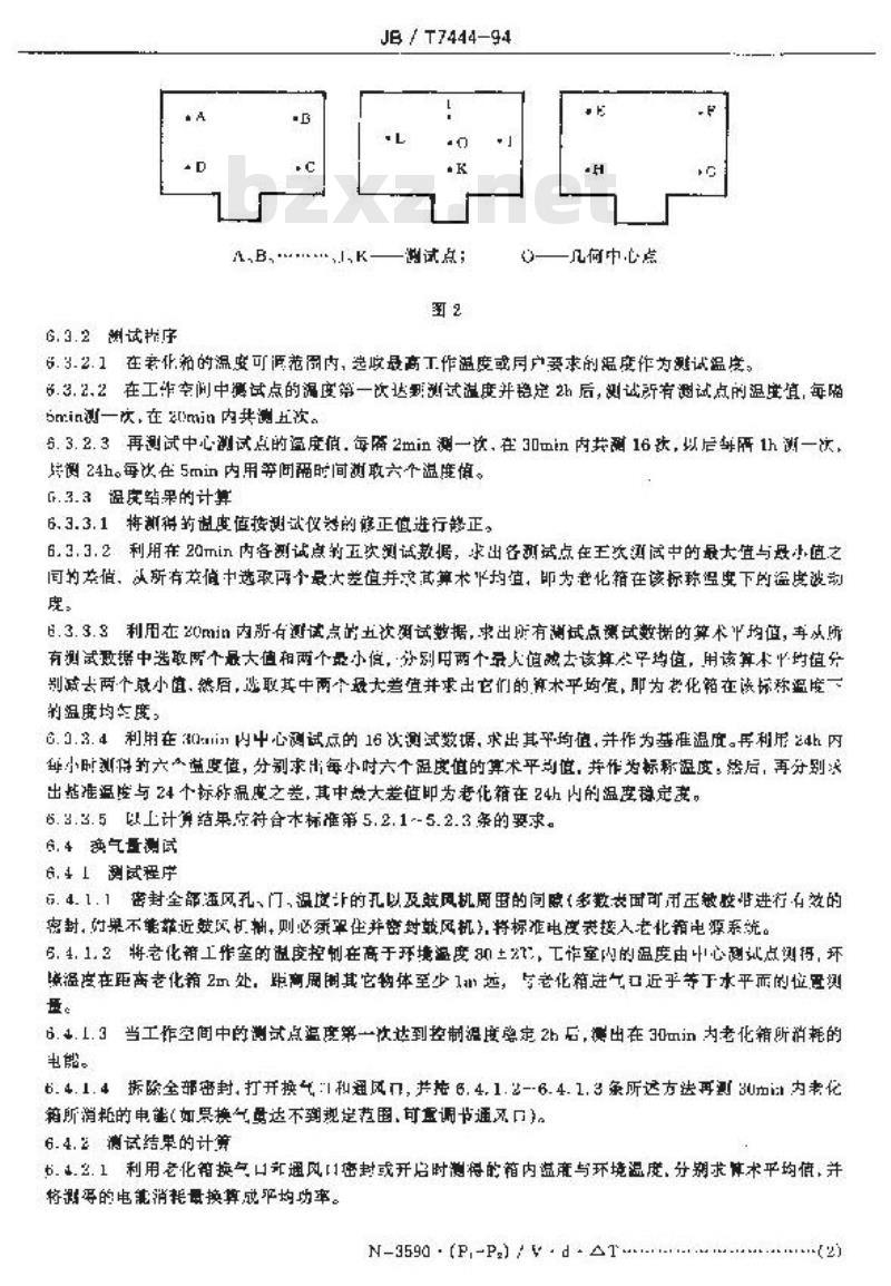 心.9.3.4利用在0in内中心测试点的16改测试数据,求出其平均值,并作为基准温底。再利用24h内每小时测得的六益度值,分别求出每小时六个盈度值的算术平均值,并作为标称温度:然后,再分别求出站准温虚与24个标称温度之差,其中最大差值即为老化箱在24h内的温度移定衰。6.3.3.5以上计算结果应符合本标准第5.2.1--5.2.3条的要求。6.4换气量测试