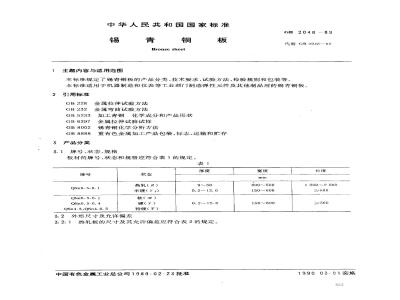 本标准规定了锡青铜板的产品分类、技术要求、试验方法、检验规则和包装等本标准适用于机器制造和仪表等工业部门制造弹性元件及其他制品用的锡青铜板2引用标准