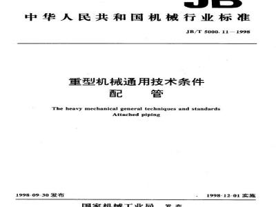 JB/T 5000.11-1998 本标准规定了配管的技术和安全要求。 本标准适用于重型机械产品本体上的油润滑、脂润滑,液压、气动和工业用水配管。 本标准不适用于压力容器配管。 (注: 本标准非等效采用了德国西马克(SMS)公司标准 SN200/7《管道、管子和容器》,日本石川岛播磨重工株式会社 BH/MH-K818《配管施工要领》和日本小松制作所株式会社标准 KES 04.912.2《管夹安装(SGP、ST配管)》编制的。) JB/T 5000.11-1998 重型机械通用技术条件 配管 JB/T5000.11-1998 标准下载解压密码:www.bzxz.net