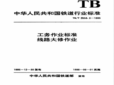 本标准规定了线路设备大修作业的线路换轨大修、成段要换在用轨、成组更换新道岔或新岔枕、成段更换混凝土枕及混凝土枕扣件、以及道口大修的作业标准。本标准适用于标准规矩铁路的线路作业。 TB/T 2658.3-1995 工务作业标准 线路大修作业 TB/T2658.3-1995