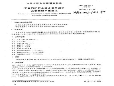 试样预先在1200℃高温灼烧,除去大部分硫酸根,用氧氧化钠熔融,盐酸浸取,高氮酸蒸发尽烟,使硅酸脱水。过滤,灼烧,弥帝,用氢氣酸除硅,称呆残渣,由其失重计算二氧化硅的含基。3试剂和溶液