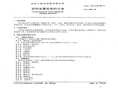 本标准是按照纺织染整助剂产品的应用范围进行分类。分为纤维纺织助剂、染整助剂]、染料后处理助剂三类。各类助剂产品可根据不向用途分为若十系列。.8纺织染整助剂的分类