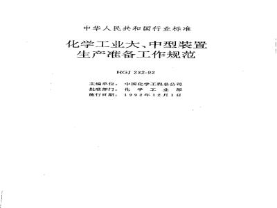 各省、自治区、直辖市和计划单列市化工厅(局)吉化公司、南化公司、大化公司、太化公司,各化工建设,设计、施工单位:我部于九八八年五月三日,以(88)化基字第381号文印发了《化学工业大型装置生产准备及试车工作规定》。根据国家计委关于《工程建设标准规范制订修订计划》的要求,部委托中国化学工程总公司在“规定”的基础上,编制了《化学工业大、中型装置生产准备工作规范》。现作为中华人民共和国化工行业工程建设标准(编号为HGI232-92),自一九九二年十二月一日起施行。化工装置的生产准备工作是基本建设的重要组成部分,对实现合理工期和顺利试车,打好初期生产的基础十分重要。各化工厅(局)和化工建设单位一定要重视这项工作,认真贯彻执行本规范。本规范由化学工业部基本建设司负责管理,希各单位将执行中存在的问题和经验函告部基建司。本规范由化工部工程建设标准编辑中心出版。(地址:北京市和平里北街化工大院3号楼,邮编:100013)化学工业部