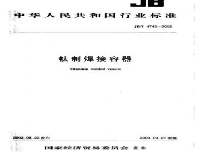 本标准规定了钛制焊接容器的设计、制造、检验和验收要求。 JB/T 4745-2002 钛制焊接容器 JB/T4745-2002 标准下载解压密码:www.bzxz.net