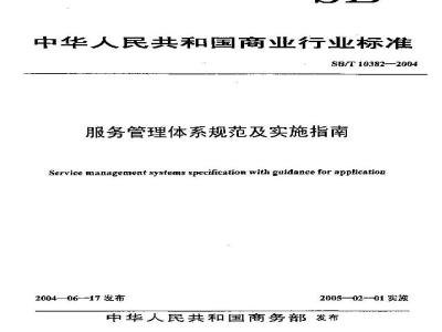 本标准为不同类型和不同规模的服务组织以及具有本标准所描述的接触过程的其它组织规定了服务管理体系规范。它适用于:a) 实施 /保持并改进服务管理体系;b) 使组织确信能符合所声明的服务方针:c) 向外界展示符合性;d) 寻求外部组织对其服务管理体系的认证;e) 对符合本标准的情况进行自我鉴定和自我声明。 SB/T 10382-2004 服务管理体系规范及实施指南 SB/T10382-2004 标准下载解压密码:www.bzxz.net