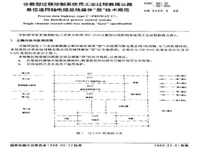 本标准规定广工业过程数据公路标准的媒体“层”(单信道同轴电缆总线2的功能,电气和机械特性。本规范给出单信道轴电缆总线局域网媒体“层”的实施准则。本部分与GB9469其他各部分以及与LAN规范的关系示T图1。