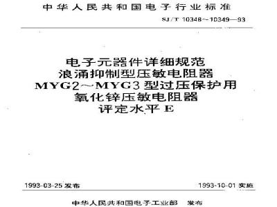 SJ/T 10349-1993 电子器件详细规范 浪涌抑制型压敏电阻器 MYG3型过压保护用氧化锌压敏电阻器 评定水平E SJ/T10349-1993 标准下载解压密码:www.bzxz.net