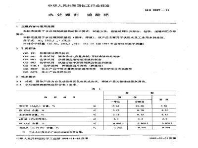 本标准适用于永处理剂蔬酸铝(固体、溶液)。该产品主要用于饮用水及工业用水的处理。分子式:Alz(SO)·xH,