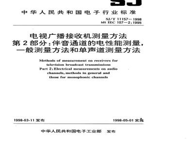 本标准叙述了符合ITU-R规定的地面广播电视标准的电视广播接收机标准测量条件和测量方法。适用于本标准的电视机可以是用于直接接收无线广播电视的电视机,也可以是经电缆网络接收的电视机,或可作为录像机的放像、家用音像设备和游戏机的监视器。 SJ/T 11157-1998 电视广播接收机测量方法 第2部分:伴音通道的电性能测量,一般测量方法和单声道测量方法 SJ/T11157-1998 标准下载解压密码:www.bzxz.net