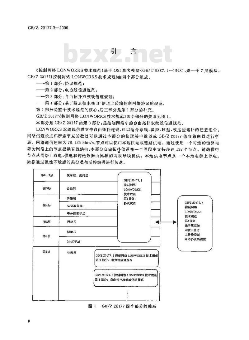 一第3部分:自由拓扑双绞线信道规范;第1部分:基于隧道技术在IP信道上传输控制网络协议的规范。第1部分是整个技术规范的核心,后三部分是第1部分的补充。GB/Z20177&控制网络LONWORKS技术规范》四个部分的关系见图1。本部分是GB/Z20177的第3部分:是控制网络中的自由拓扑双绞线信道规范。LONWORKS双绞线信支持自由拓扑连线,可以适合总线、星型,环型,或这些拓扑的任意组合。网络信道长度和所连节点的数日可以通过本部分的物理层中继器或GB/Z20177兼容路由器进行展。网络通信速率为78.125khit/s,节点可以使用本地供电或链路供电。通过使用一个可选的链路电源为网络上的节点提供直流供电,本部分白出拓扑信道在一个网段中支持多达128个节点。链路供电节点从网络上取电,供电和传送数据由同样的两根导线提供。本地供电节点从一个本地电源上取电。数据通过极性不敏感的差分曼彻斯特编码进行传送。第6、7层