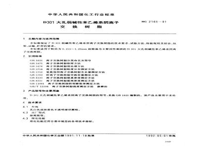 HG/T 2165-1991 D301大孔弱碱性苯乙烯系阴离子交换树脂 HG/T2165-1991 标准下载解压密码:www.bzxz.net