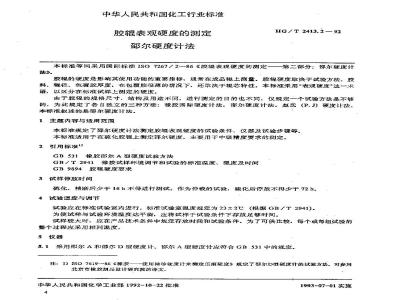 5.1采用邵尔A和邵尔D型硬度计邵尔A型硬度计应符合GB531中的规定,注:1)JSO7619-86《橡胶——使用抽珍硬度计来测定压痕砸度》规定了邵尔D型硬度计的试验方法。可参用北东市橡胶制品设计研究院的译文,中华人民共和国化学工业部1992-10-22批准1993-07-01实施