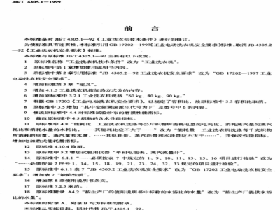 本标准的附录A,附录B均为标准的附录。本标准从实施日起,同时代替JB/T4305.192。本标准的过渡期建议为6个月。:本标准由广州电器科学研究所提出并归口。本标准负责修订单位:广州电器科学研究所。本标准参加修订单位:江苏海狮机械集团公司、广州洗涤机械实业公司、广州三彩洗涤设备公司、无锡小天鹅苏泰洗涤机械有限公司、广东顺德伦教新力洗涤机械广。本标准主要起草人:孙恩平、陆青、梁国纬、黎坚达、张建昌、汤荣发。本标准委托广州电器科学研究所解释。1范围