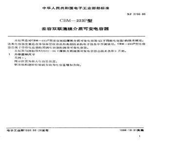 本标准是对CBM-223P型差容双联薄膜介质可变电容器(以下简称电容器)的技术规定。这类电容器主要是在半导体管收音机和类似技术的电子设备中作调谐用。CBM-223P型电容器是属于带有电连接的预调电容器的调谐可变电容器。 SJ 2706-1986 CBM-223P型差容双联薄膜介质可变电容器 SJ2706-1986 标准下载解压密码:www.bzxz.net