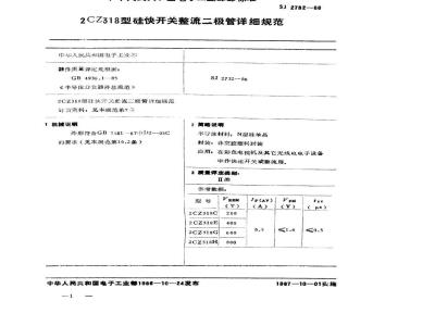 在彩色电视机及其它无线电电子设备中作中速开关或整流用。 SJ 2732-1986 2CZ318型硅快开关整流二极管详细规范 SJ2732-1986 标准下载解压密码:www.bzxz.net