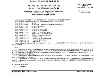 本标准规定了绘制各种电气图用的电力、照明和电信布置图图形符号。GB4728《电气图用图形符号》国家标准包括以下13个部分:GB 4728.1—85