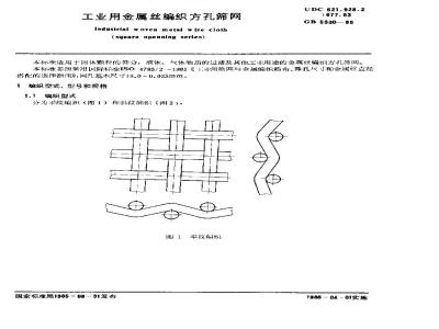 本标准用于固体颗粒的筛分,液体、气体物质的过滤及具他工业用途的金属丝编织方孔筛网。本标参照采用国际标准IS04783/2·-1981≤1业用筛网与金属编织筛布,筛孔尺寸和金丝直径播配的选择指南》,网孔基木尺寸16.0~0.025mm。1编织型式、型号和规格