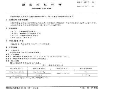 本标准规定了固定式杠杆秤的产品分类、技术要求、试验方法、检验规则、标志、包装、运输和贮存。本标准适用于固定式杠杆秤(地中衡、钢材秤、牲畜秤等)。 GB/T 5037-1994 固定式杠杆秤 GB/T5037-1994 标准下载解压密码:www.bzxz.net