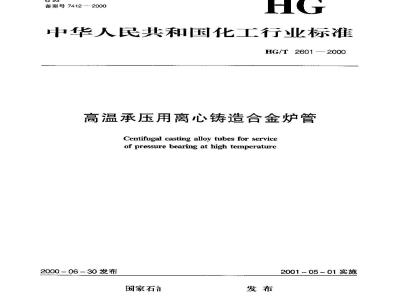 HG/T2601一1994《高温承压用离心铸造合金炉管技术条件》发布以来,离心铸造合金炉管制造上取得了很大的突破,无论在材料、品种、质量及检测技术上都有了新的进展。近年来,我们与国外厂商及用户的联系日益深化和紧密,因而对国外同类标准的研究更深人,将国外同类标准的可借鉴之处与用户要求相结合,形成科学的、对设计、制造、使用均有实用价值的行业标准是修订HG/T2601—1994的指导思想。本标准参照了我国部分企业和国外的有关标准和技术要求,并总结了长期生产实践的经验,对HG/T2601一1994作了较大的改动和增补,使标准更趋严密,而且加强了可操作性。本标准规定了34个材料牌号,未列入表中的牌号工厂也可接用户要求提供。本标准自实施之日起,同时代替HG/T2601一1994。本标准的附录A是标准的附录,附录B是提示的附录。本标准由国家石油和化学工业局政策法规司提出。本标准由化学工业化工机械与设备标准化技术委员会归口。本标准起草单位:四川化工机械厂、化工部化工机械研究院。本标准主要起草人:王业功、陈治平、杨建生、部瑞虎、陈宪荣、黄丽、陈斌。本标准于1984年12月首次发布,于1994年4月第一次修订。Ⅱ