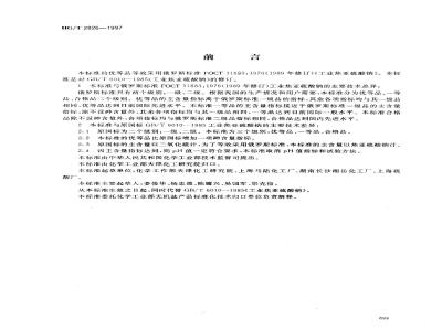 本标准的优等品等效采用俄罗斯标准rOCT11683:1976(1989年修订)《工.业焦亚硫酸钠》。本标准是对(HB/T6010—1985《工业焦业硫酸钠》的修订。1本标准与俄罗斯标准TOCT11683:1976(1989年修订)工业焦亚硫酸钠的主要技术差异:俄岁斯标准只有两个级别:一级、二级。根据我国的生产情况和用户需要,本标准分为优等品、一等品、合格品三个级别。优等品的主含量指标高于俄罗斯标准一级品的指标,其余各项指标均与其一级品相同,优等品达到目前国际先进水平。本标准一等品的主含量指标接近于俄罗斯标准一级品的主含量指标,除不设砷含量外,其余各项指标均与其一级品相同,一等品达到目前国际一般水平。本标准合格品除不设砷含量外,各项指标均与俄罗斯标准二级品指标相同,合格品达到国内先进水平。2本标准与原国标GB/T6010--1985工业焦亚硫酸钠的主要技术差异:2.1原国标为二个级别:一级、二级。本标准为三个级别:优等品、一等品、合格品。2.2本标准的优等品比原国标增加一项砷含量指标。2.3原国标的主含量以二氧化硫计,为了等效采用俄罗斯标准,本标准的主含量以焦亚硫酸钠计。2.4因主含量指标达到,则pH值一定符合要求,本标准取消pH值指标和试验方法。本标准由中华人民共和国化学工业部技术监督司提出。本标准由化学工业部天津化工研究院归口。木标准起草单位:化学工作部天津化工研究院、上海马陆化工厂、湖南长沙湘岳化工厂、上海硫酸厂。