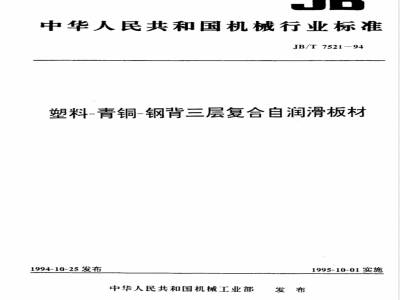 本标准规定了塑料-青铜-钢背三层非合自润滑板材的技术要求,试验方法,检验规则及标志、包装、运输、贮存等。 JB/T 7521-1994 塑料-青铜-钢背三层复合自润滑板材 JB/T7521-1994