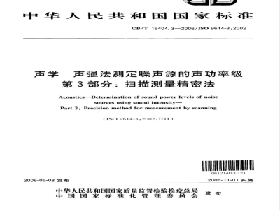 GB/T16404.3一2006声学声强法测定噪声源的声功率级第3部分:扫描测量精密法本部分为GB/T16404的第3部分,等同采用ISO9614-3:2002《声学声强法测定噪声源的声功率级第3部分:扫描测量精密法》。本部分在等同采用ISO9614-3:2002过程中,将其规范性引用文件和参考文献中部分ISO标准替换成我国目前正在实施的对应的国家标准。在规范性引用文件中加入了GB3102.7一1993《声学的量和单位》和GB/T3947-1996《声学名词术语》,并进行了编辑性修改。本部分的附录A、附录D、附录E、附录F、附录G、附录H、附录I、附录J为资料性附录,附录B、附录C为规范性附录。