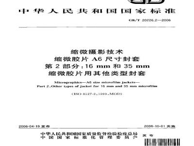 GB/T 20226的本部分规定了用于16mm缩微胶片用的四片道封套的特征、35mm缩微胶片用的二片道封套的特征、一条35mm和两条16mm片道封套的特征以及两条35mm和一条16mm片道封套的特征。本部分适用于16mm和35mm缩微胶片用不同类型封套的制作。