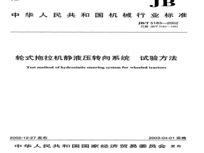 本标准代替JB/T5183一1991《轮式拖拉机静液压转向系统试验方法》。本标准与JB/T5183一1991相比主要变化如下:增加了定义一节;