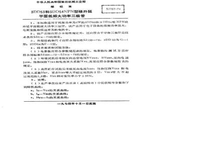 1、本标准适用于耗散功率为5W的3DD53和8DD54型NPN硅外延平面低频大功率三极管。该产品用于电子设备的低频功率放大、电源变换和低速开关的电路中。2、该产品除应符合本标准规定外,还应符合半导体三极管总技术条件SJ61473的规定。